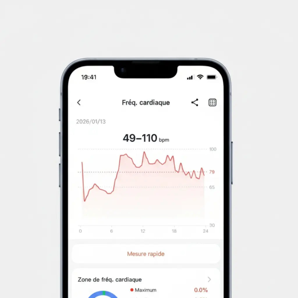 - Fréquence cardiaque (suivi continu 24/7)