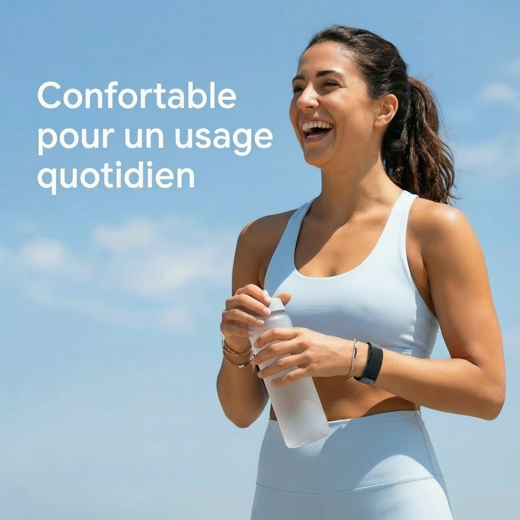 Un bracelet en nylon réglable est inclus par défaut pour un port confortable au quotidien, et un bracelet sport en silicone est actuellement offert pour celles et ceux qui préfèrent une sensation différente ou un usage plus actif.
